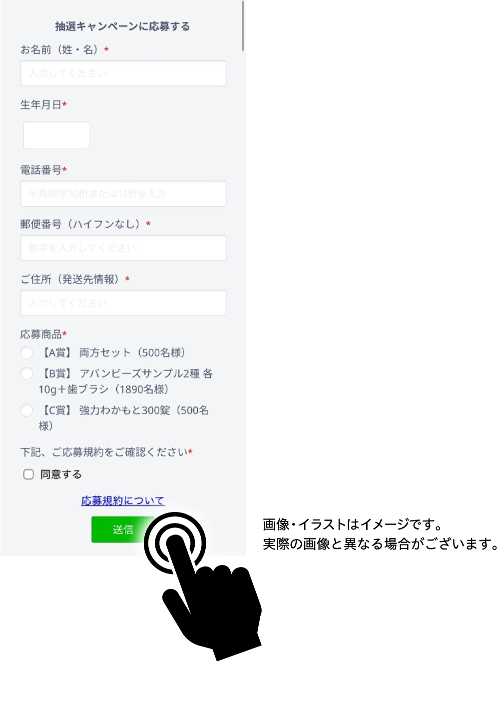 LINE上に立ち上がった応募フォームに、必要事項をご入力のうえ、「送信」ボタンをタップし、応募完了です。